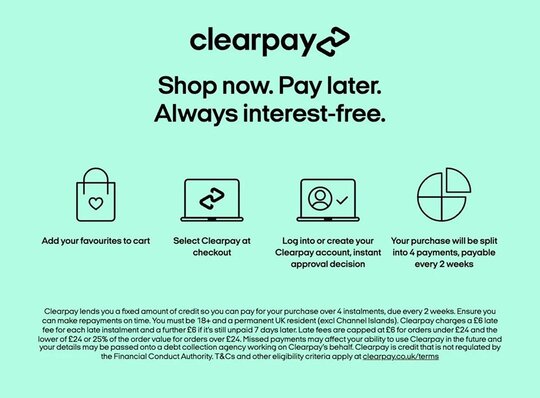 • 4 payments of xx with Clearpay ⓘ £xx off your first order! Min spend £xx terms apply; or