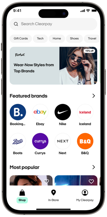 Explore app-only brands in the Shop in Clearpay app section in the Shop tab.